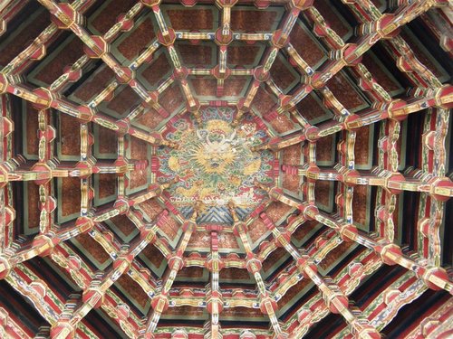 所謂「藻井」是以不斷向中心懸挑內縮的斗拱,交織成網狀的傘蓋形頂棚,因形狀似蜘蛛網,所以又叫做「蜘蛛結網」。